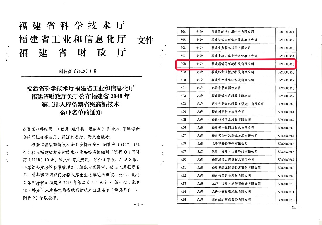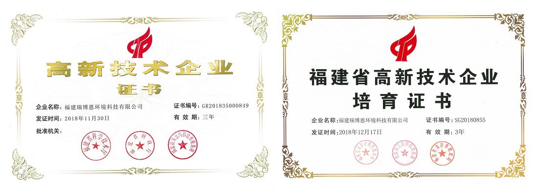 前言:福建瑞博恩环境科技有限公司凭借不断增强的自主创新能力和良好的市场发展前景,被认定为“国家高新技术企业”、“福建省高新技术企业”。